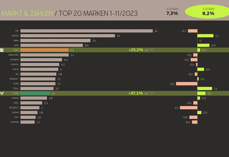 Mit 18.208 Neuzulassungen freuen sich Seat und Cupra dennoch über einen schönen Erfolg und einen Marktanteil von 8,2 Prozent. In der Statistik werden die beiden Marken freilich getrennt gelistet, Seat kommt auf 5,1 Prozent (1-11/2023) und liegt damit hinter VW, Skoda, BMW und Audi auf Gesamtrang vier. Cupra landet mit 3,1 Prozent auf Rang 13, bei den Elektromarken liegt die spanische Performence-Marke mit 5,9 Prozent Marktanteil auf Rang sechs. Stark zulegen konnte Cupra auch bei Firmen- und Flottenkunden.