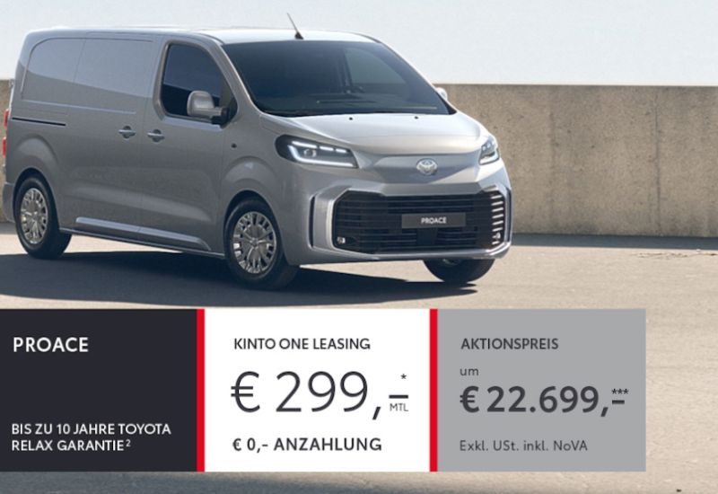 Wie wäre es zum Beispiel mit dem Toyota Proace, dem Allrounder unter den Nutzfahrzeugen? Er überzeugt mit einer Ladelänge von bis zu 4 Metern, Rückfahrkamera und Parksensoren hinten, sowie einem umklappbaren Mittelsitz. All das macht den Toyota Proace zu einem perfekten Geschäftspartner, der jede Aufgabe meistert. Wählen Sie zwischen einem konventionellen oder vollelektrischen Antrieb, der sogar bis zu 1,0t Anhängelast bietet. Das alles schon um € 299,- mtl.* mit € 0,- Anzahlung im KINTO ONE Leasing oder als Aktionspreis um €22.699,-*** exkl. USt. inkl. NoVA.