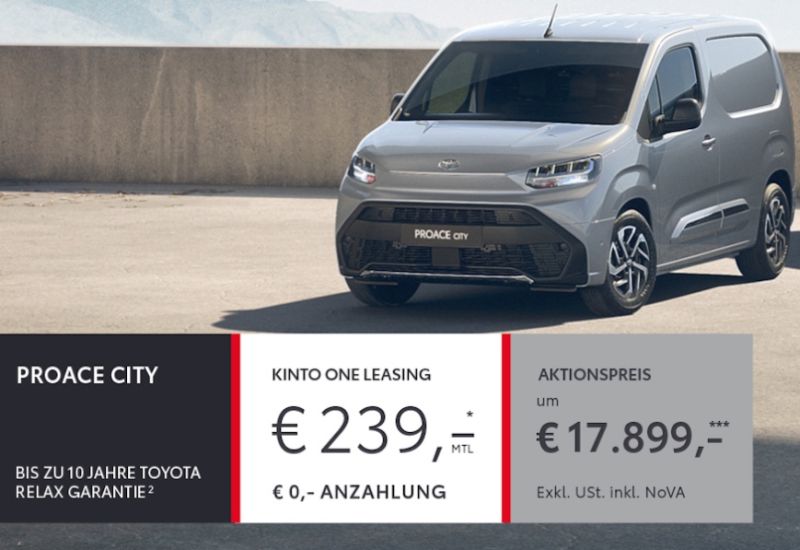 Wenn es kompakter sein soll, dann empfehlen wir Ihnen den Toyota Proace City. Der ist außen kompakt, aber innen extrem vielseitig. Mit bis zu 4,4 m3 Ladevolumen in der elektrischen Antriebsvariante haben Sie genügend Platz für Ihr Business. Das macht den Proace City zu einem perfekten Stadtlieferwagen. Nur während der Toyota Gewerbewochen im KINTO ONE Leasing um € 239,- mtl.* bei € 0,- Anzahlung oder als Aktionspreis um € 17.899,-*** exkl. USt. inkl. NoVA.