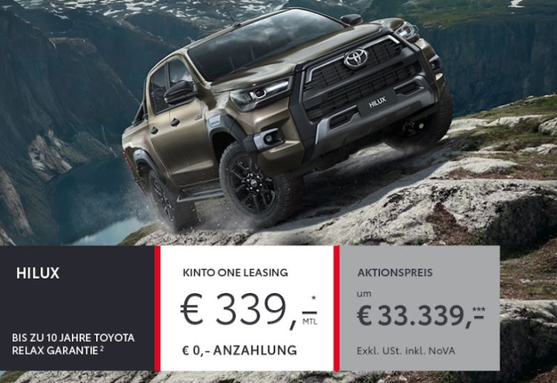 Robustes Design, bärenstarke Leistung und höchste Funktionalität bietet Ihnen unser Pick-up, der Toyota Hilux. Mit herausragenden Gelände-Fahreigenschaften und bis zu 3,5t Anhängelast ist der Toyota Hilux für jedes Abenteuer bereit, ohne dass Sie auf den Komfort eines Pkw verzichten müssen. Entscheiden Sie sich für den Toyota Hilux um nur € 339,- mtl.* bei € 0,- Anzahlung im KINTO ONE Leasing oder einmalig € 33.339,-*** exkl. USt. inkl. NoVA.