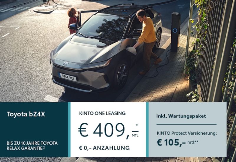 Der Toyota bZ4X kommt als vollelektrischer Allrad SUV besonders elegant daher und vereint Innovation, Effizienz sowie Dynamik. Im Toyota bZ4X finden Sie alles, was Sie von einem modernen Dienstwagen erwarten: höchste Effizienz, Eleganz, Reichweite und zügiges Aufladen. Alles um € 409,-* mtl. im KINTO ONE Leasing mit € 0,- Anzahlung.